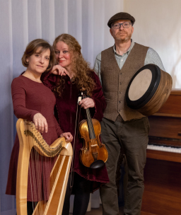 Ihr Spiel verbindet Energie und Poesie – mit dem warmen Klang der Geige (Alexandra Iosif), der leuchtenden keltischen Harfe (Yvonne Deusch-Cammarosano) und dem erdigen Puls der Bodhrán (Michael
